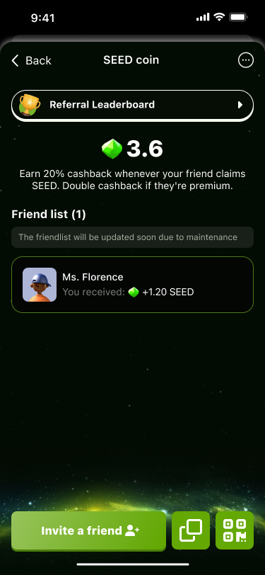 Every time your friend claims SEED, you'll get **20% cashback**.&#x20;