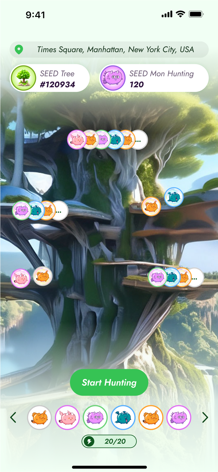 Energy is essential for earning tokens. Replenishment only starts after obtaining an **NFT SEED Mon**. Players choose their SEED Mon and press Start to begin their journey.