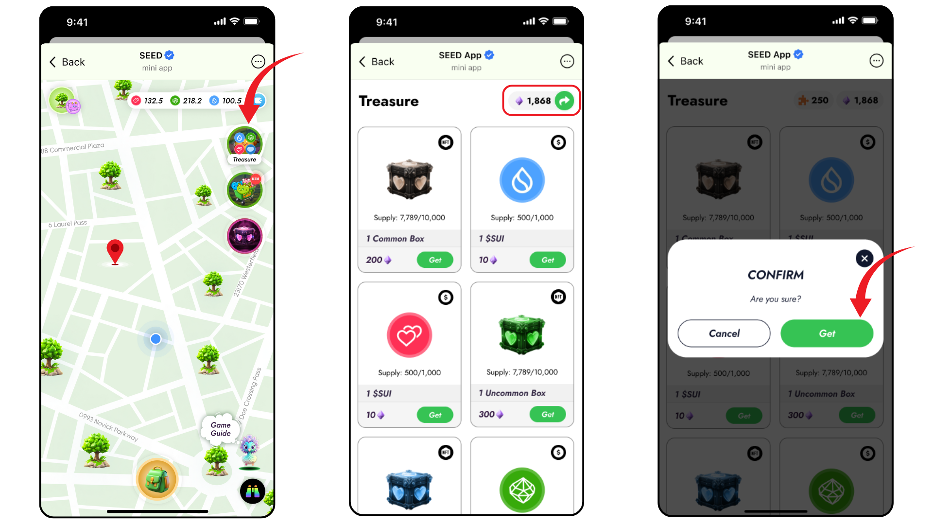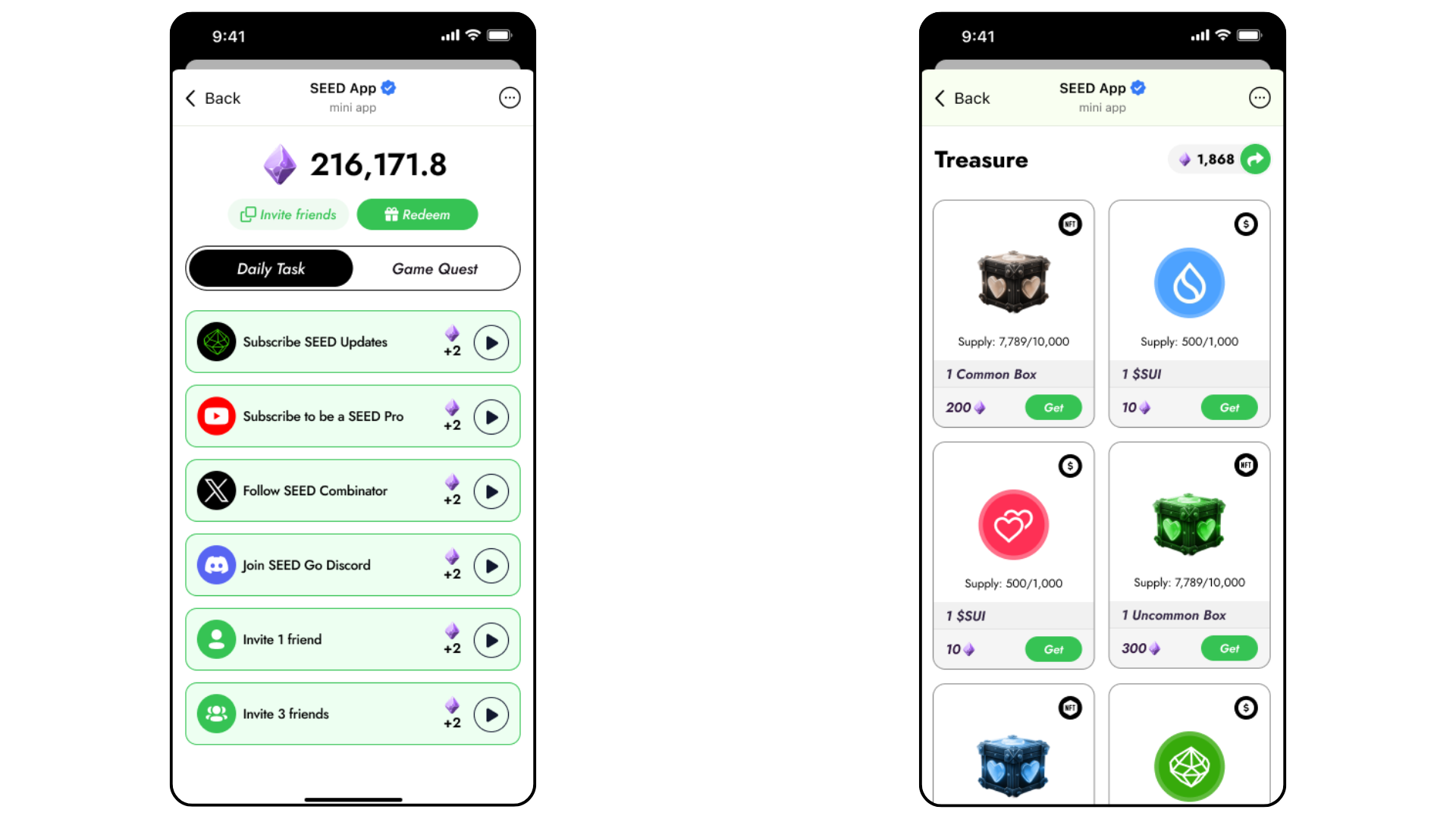 In SEED, the Mission is created to help you boost your progress by completing tasks there. When a mission is completed, you can claim an equal amount of Stone as the reward. Go to the Treasure section in the app, then use Stone to trade for other SEED App's assets, including SUI, SLOVE, SEED, and SEED Mon Box.